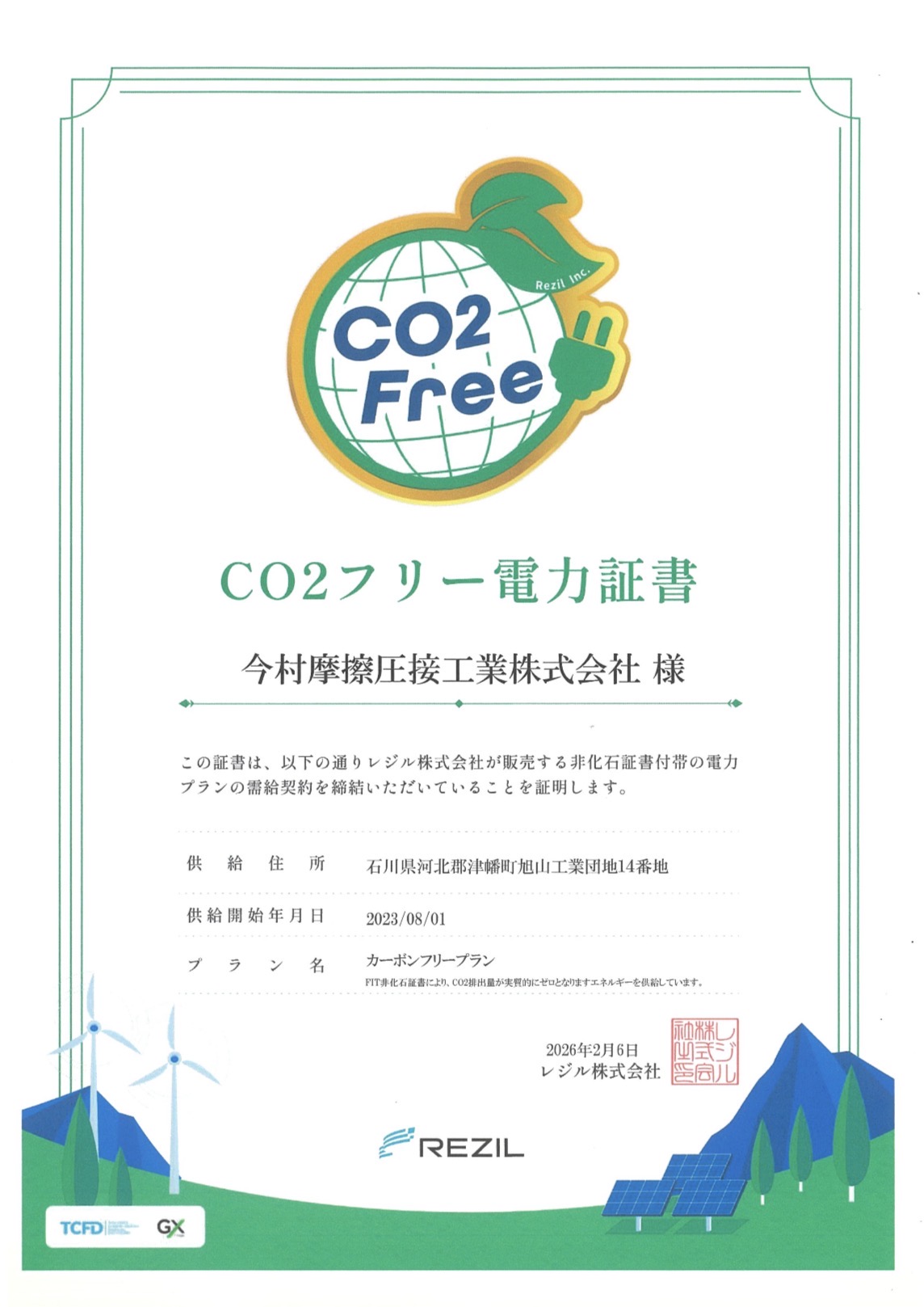 CO2フリー電力使用のご案内ニュース / 2026年2月23日 2026年2月23日 弊社では地球環境改善の取組みとして、CO2フリー電力(発電時に二酸化炭素を排出しない、または実質的に排出ゼロとみなされる電力)を使用しています。 この度、証書が発行されましたのでご案内いたします。 豊かな自然環境を次世代へ引き継ぐため、環境負荷低減に繋がる行動と業務改善を推進いたします。 Screenshot